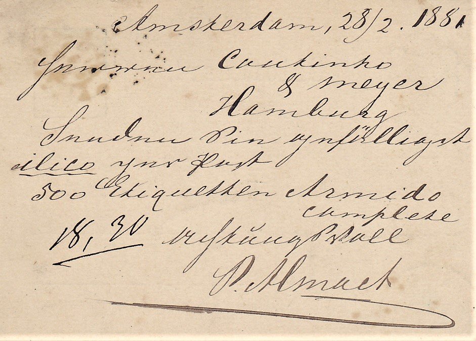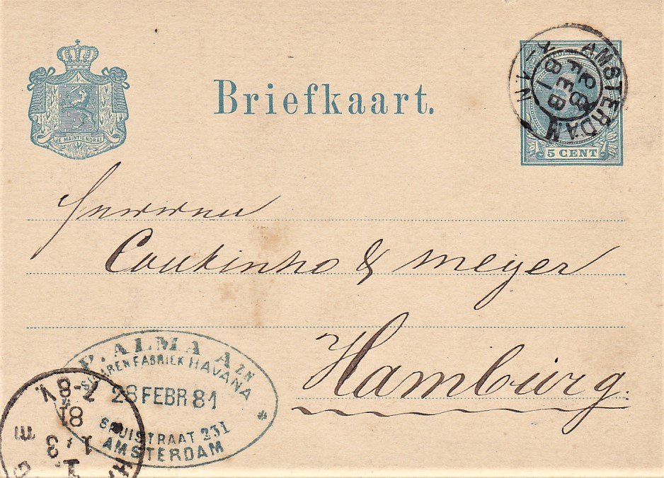 Alma P. Azn, Sigarenfabriek .Havanna. - Amsterdam, anno 1881, BRIEFKAART M merken : oude graaf, de-oude jonker,- de-drie kistjes, de-javaantje, 't-lycurgus-otto van rees, gouv.-gen-vondel