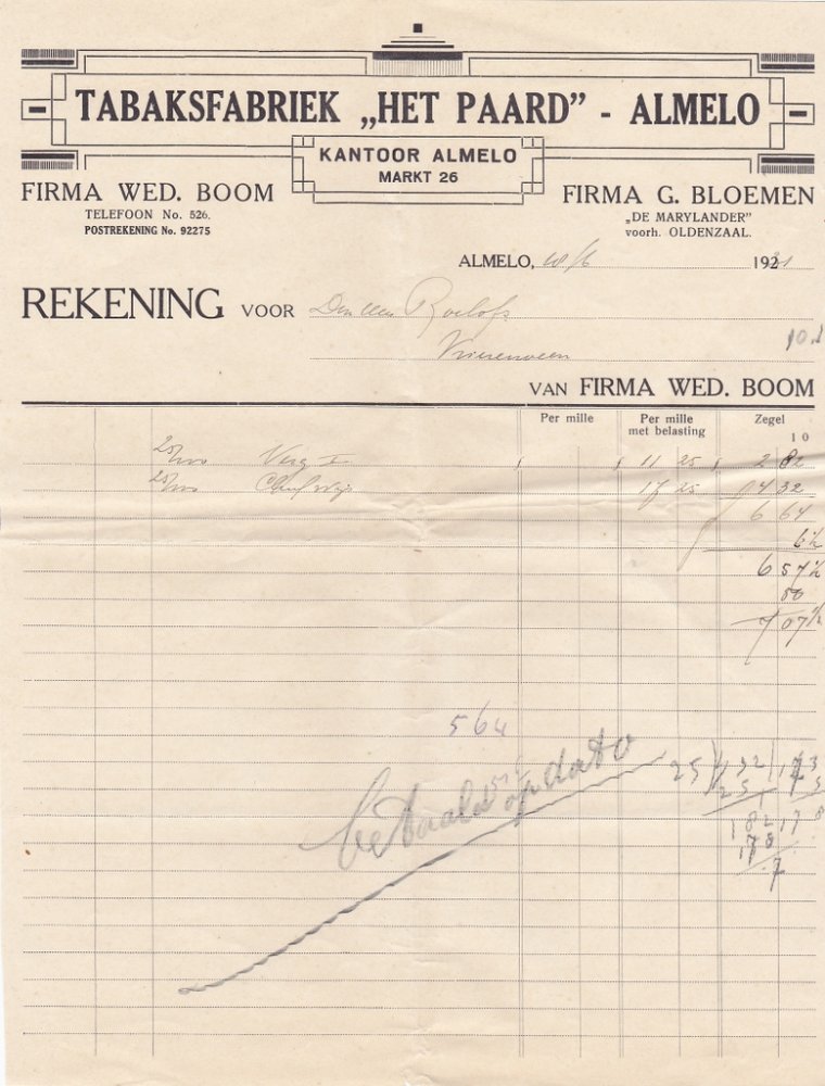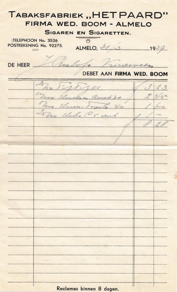 Boom Wed. Tabaksfabriek het Paard - Almelo 31 Mrt 1939 M