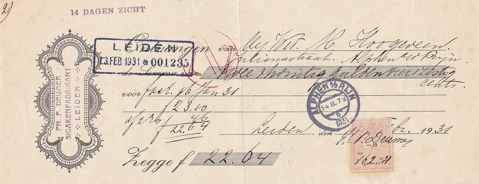 Merken= Minister Colijn + Willem IV Graaf van Holland  Deumer Ph.P. Sigarenfabrikant - Leiden  M
