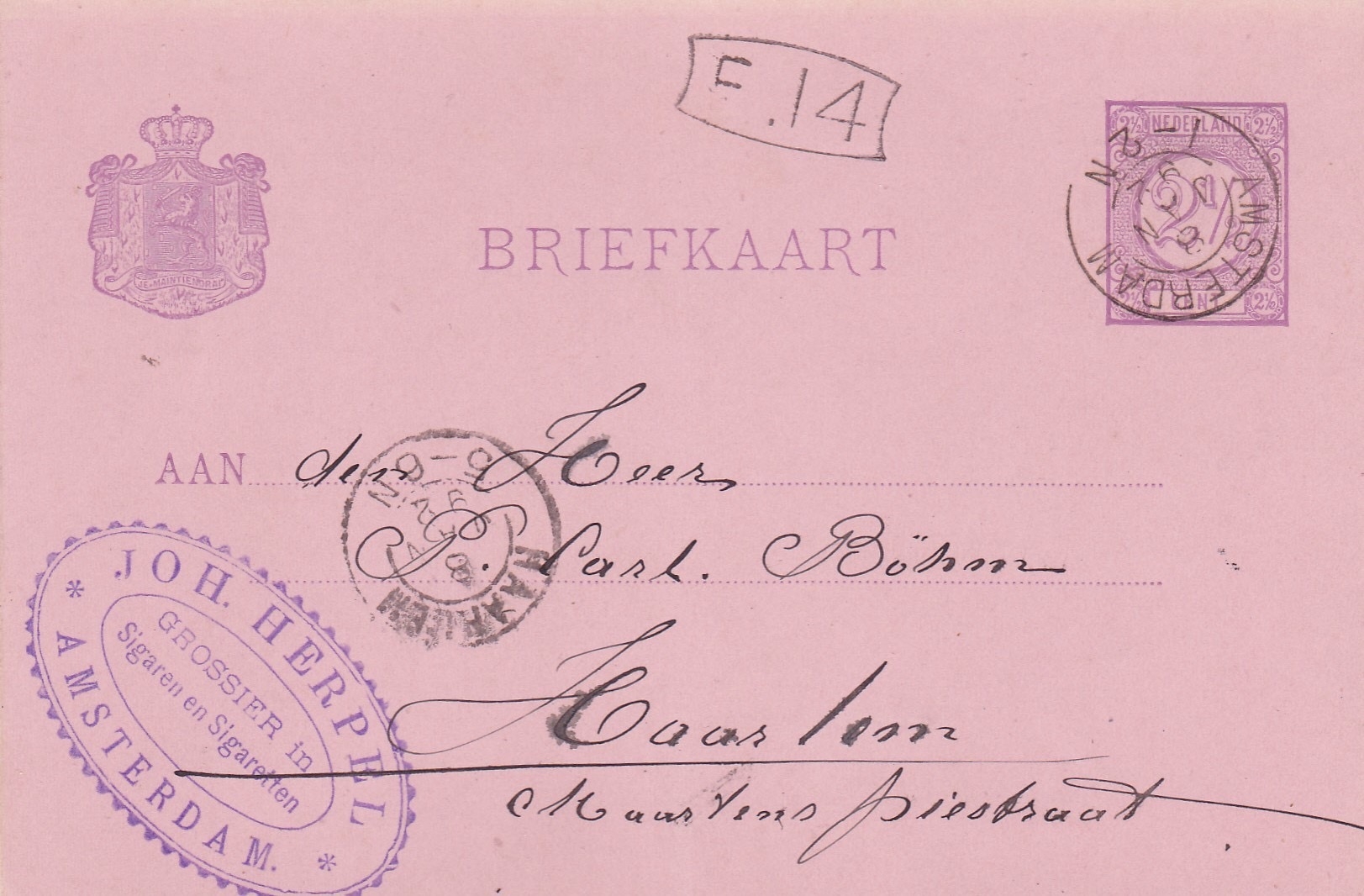 Herpel Joh. grossier in Sigaren en Sigaretten - Amsterdam anno 18-jan-1892 BRIEFKAART M