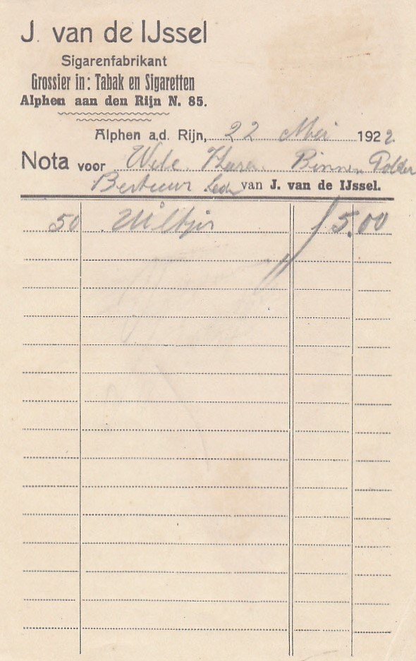 IJssel J. van de Sigarenfabrikant Grossier in Tabak en Sigaren - Alphen a.d. Rijn anno 22-Mei-1922 M