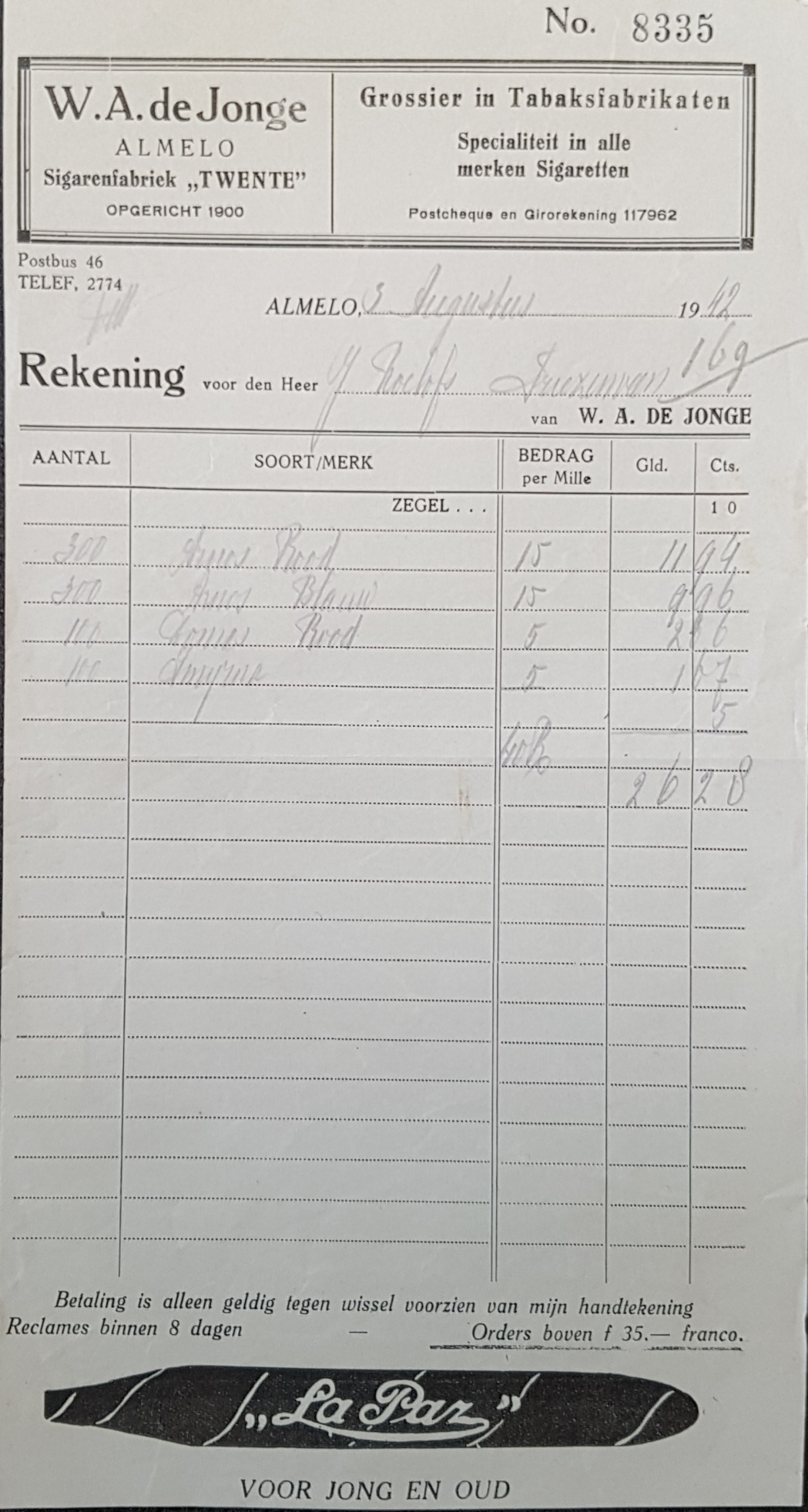 Jonge W.A. de Sigarenfabriek TWENTE - Almelo 3 Aug 1942 M