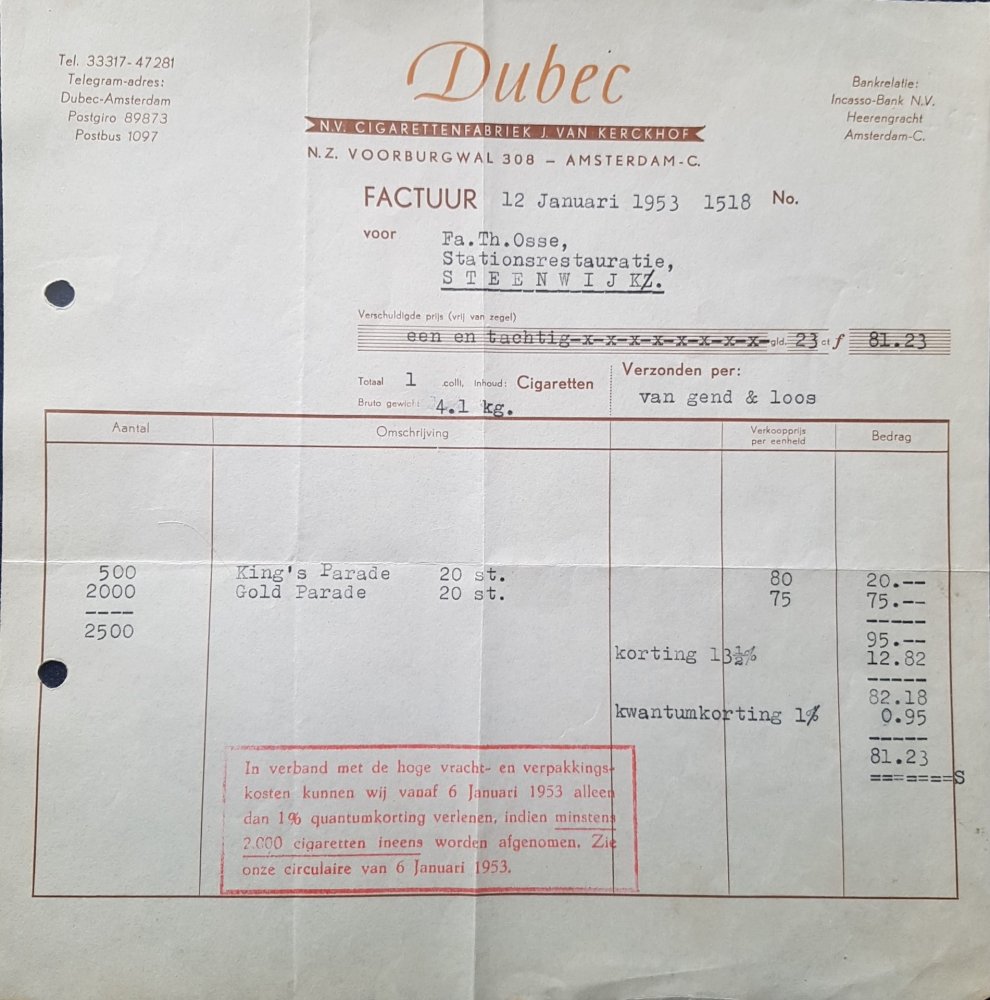 Kerckhof, J. van Dubec Sigarettenfabriek N.V. – Amsterdam 12 Jan 1953 M