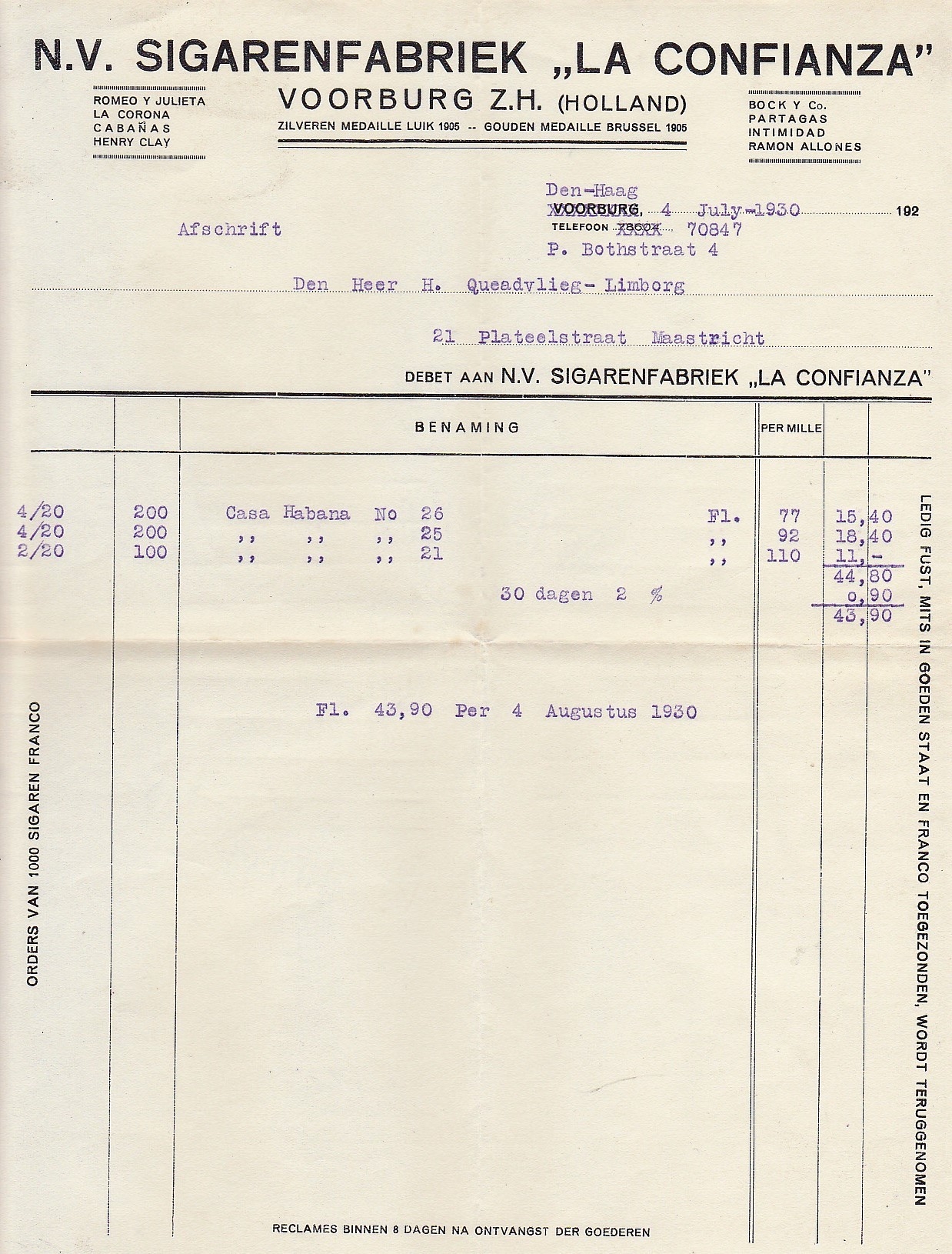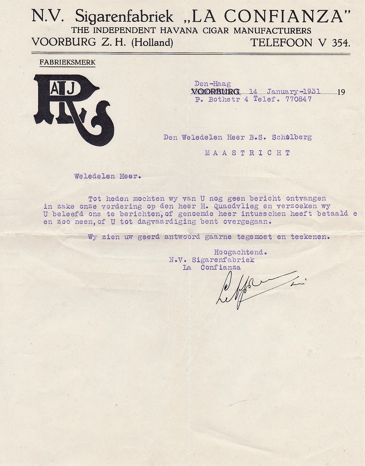 La Confianza, Sigarenfabriek N.V., Voorburg, anno 1930, M