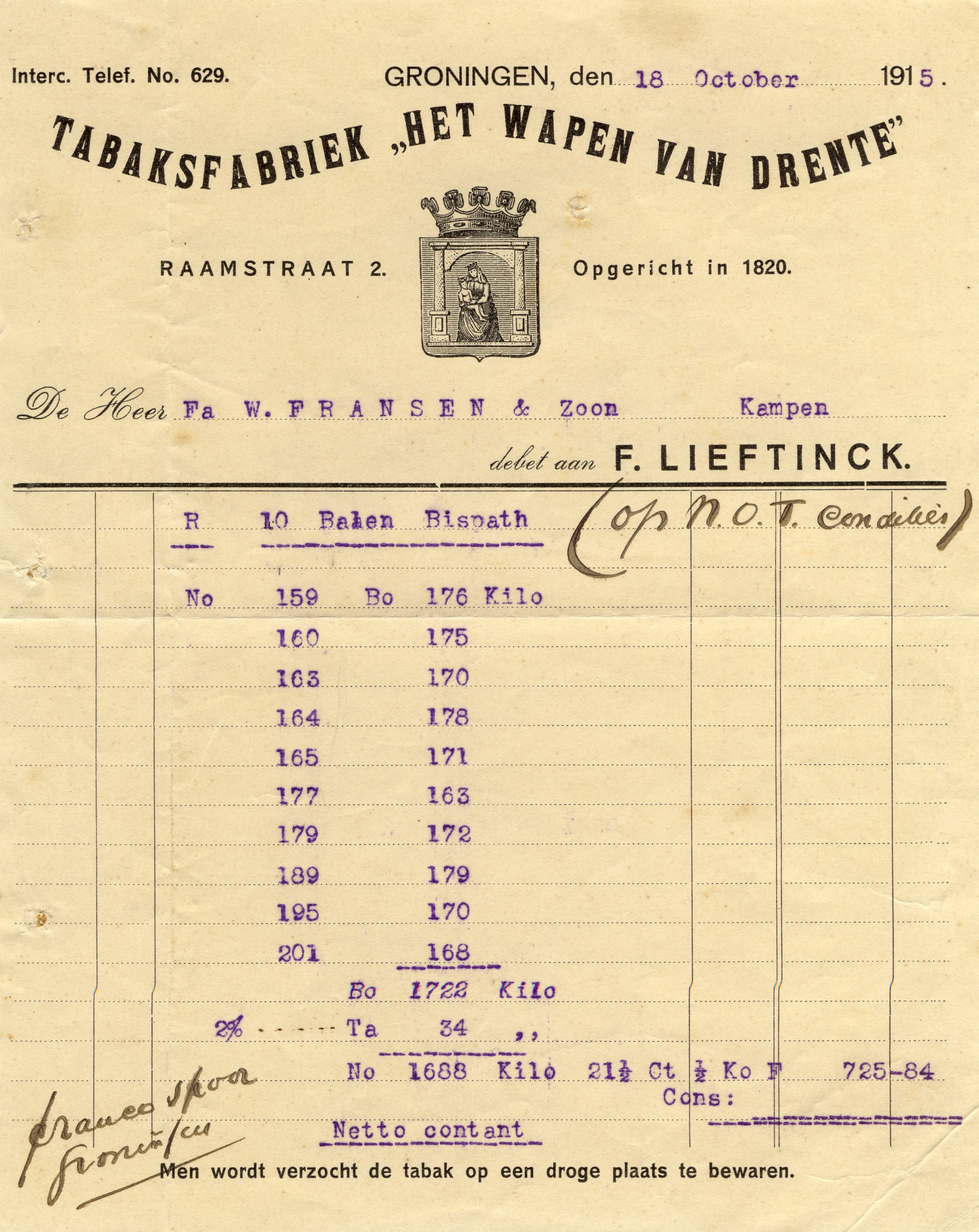 Lieftinck's Het Wapen van Drente Tabaksfabriek - Groningen 18 Okt 1915 M