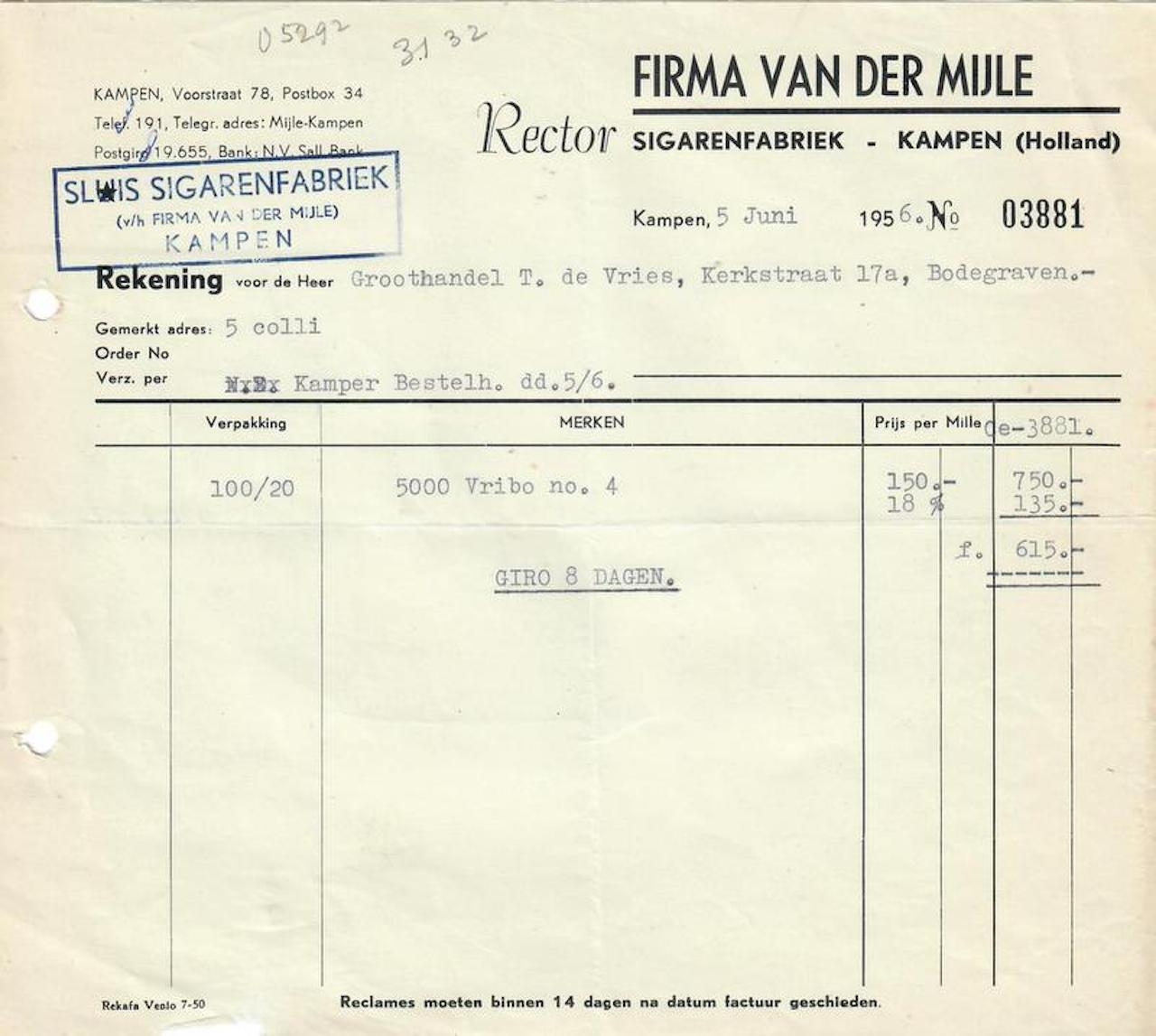 Mijle van der Firma Sluis Tabaks- en Sigarenbedrijven - Kampen 5-6-1956 L