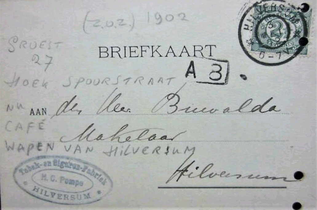 Pompe H.C. Sigaren en Tabakshandel - Hilversum anno 1902 RECLAME KAART BIJLAGE MP.