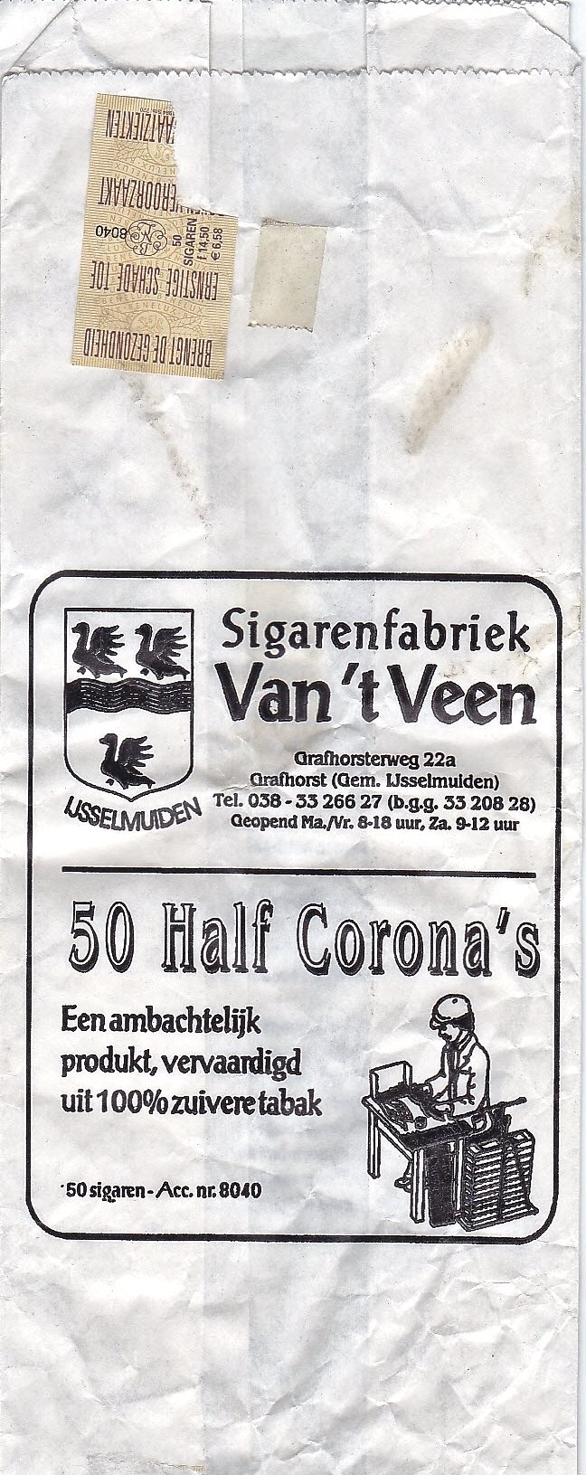 Van t Veen Sigarenfabriek, Grafhorst, HALF CORONA S, zak, 50 sigaren, prijs f14,50, banderol 1840 M