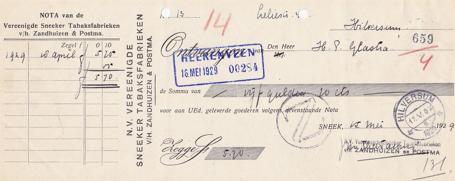 Vereenigde Sneeker Tabaksfabrieken N.V., vh Zandhuizen en Postma, Sneek, anno 18-april-1929, M