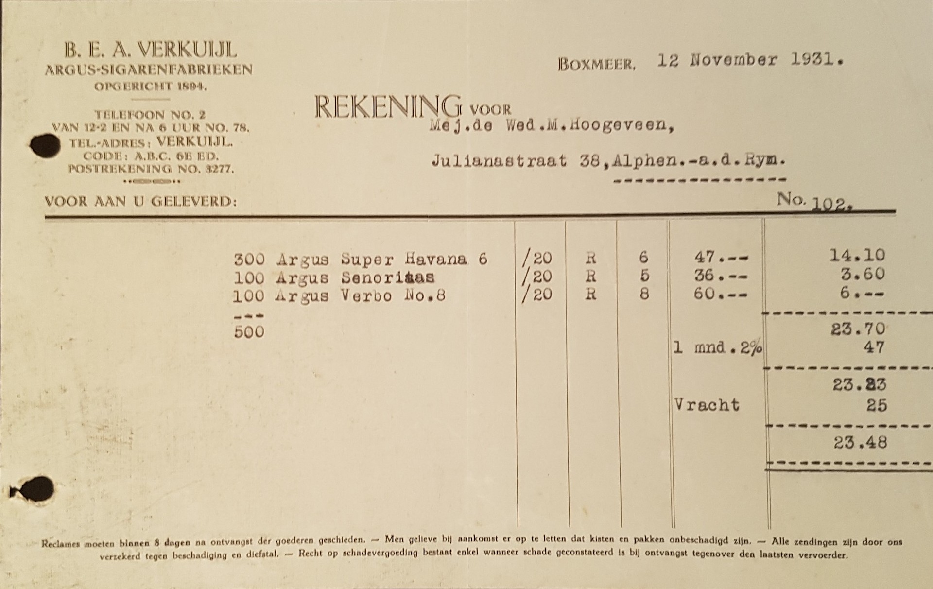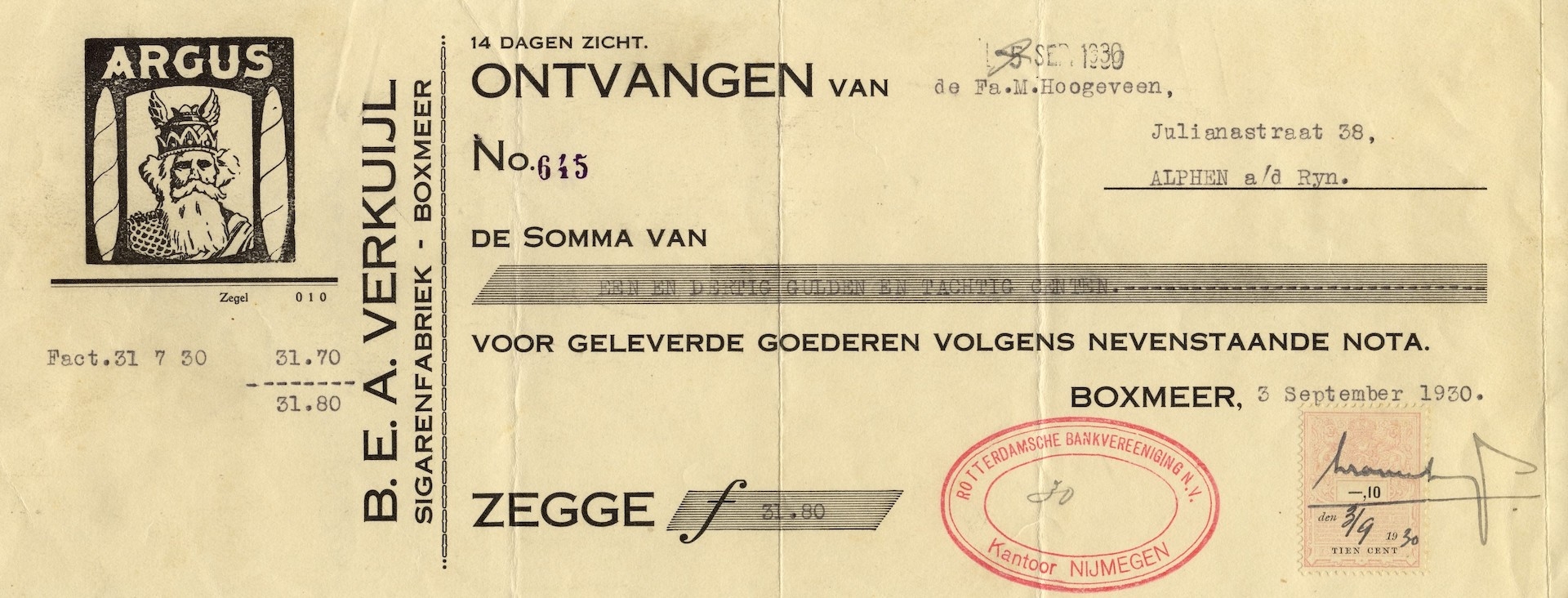 Verkuijl B.E.A. Sigarenfabriek -Boxmeer KWITANTIE 3 Sep 1930 M