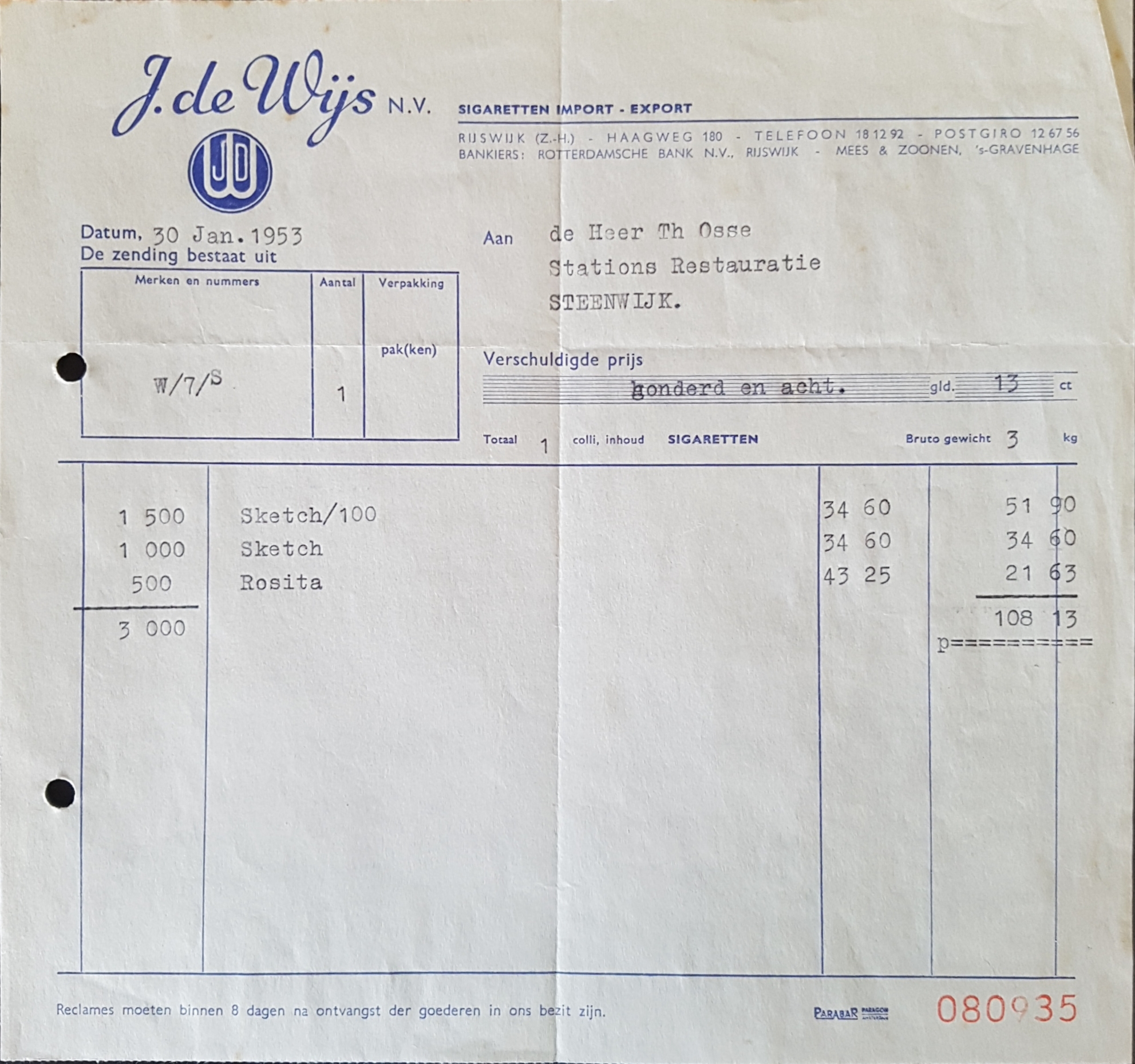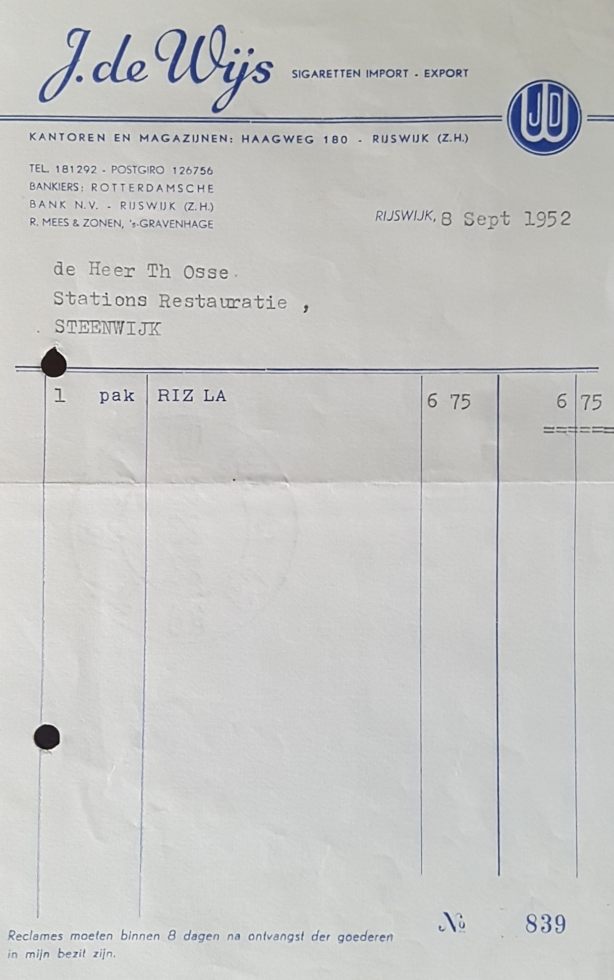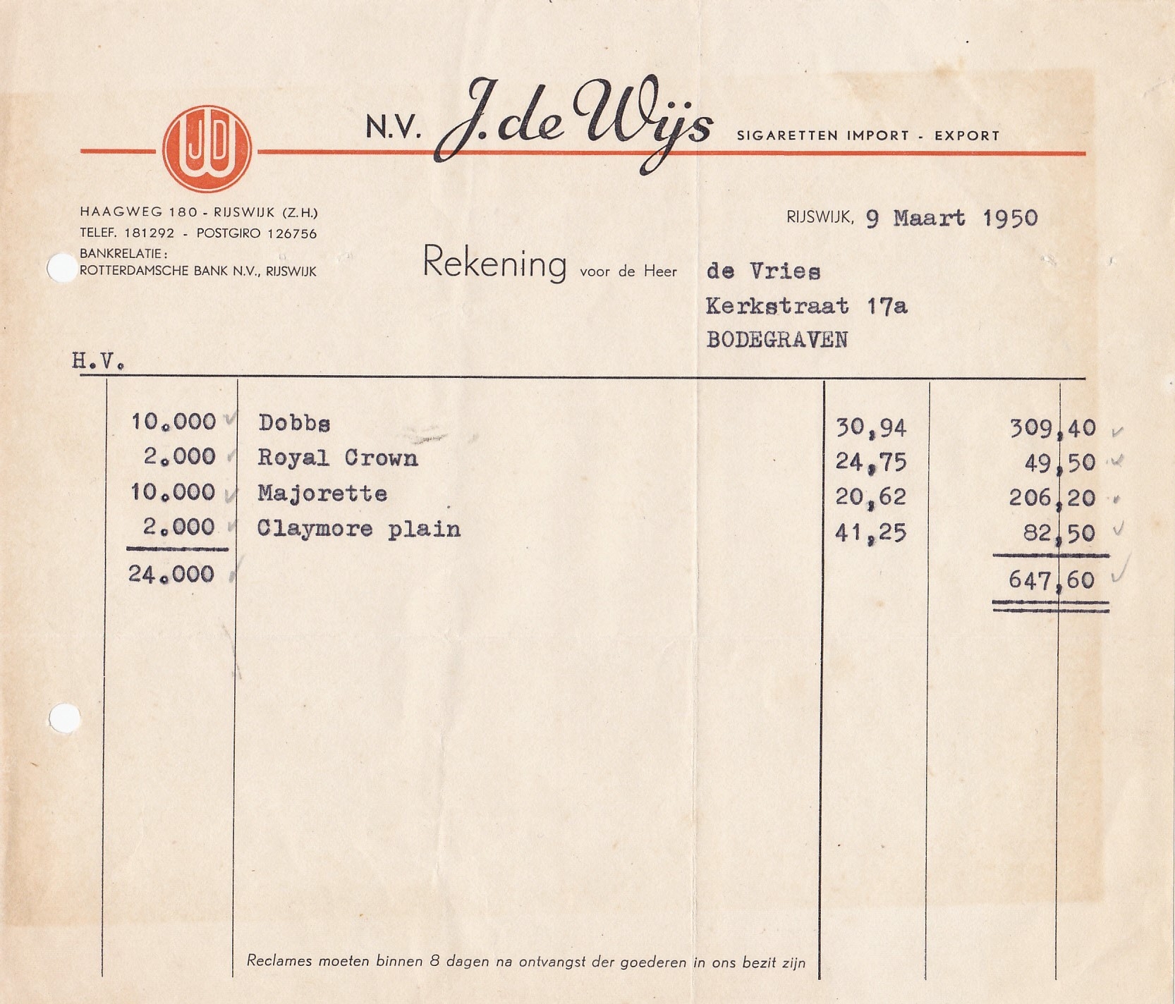 Wijs J. de Sigaretten import-export - Rijswijk 9 Mrt 1950 M