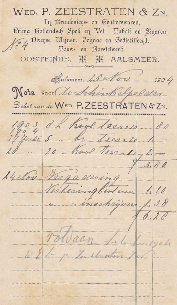 Zeestraten Wed.P. en Zn Kruideniers en Grutterswaren Tabak en Sigaren - Aalsmeer anno 25-Nov-1904 M